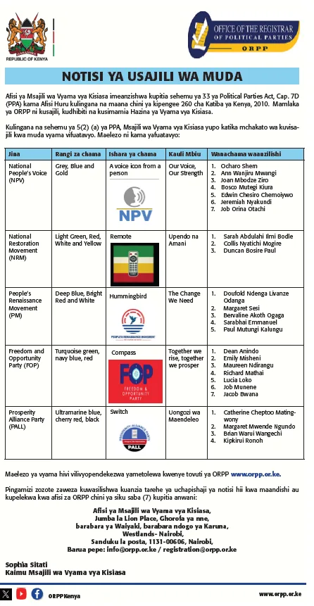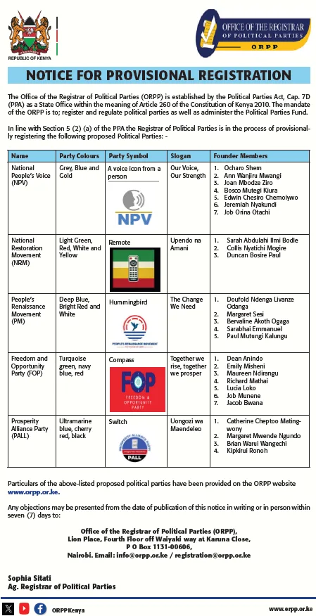 Office of the Registrar of Political Parties (ORPP) is a state office established under Article 260 of the Constitution of Kenya, 2010, and the Political Parties Act, 2011. The mandate of the office, among others is to regulate the formation, registration, and funding of political parties in accordance